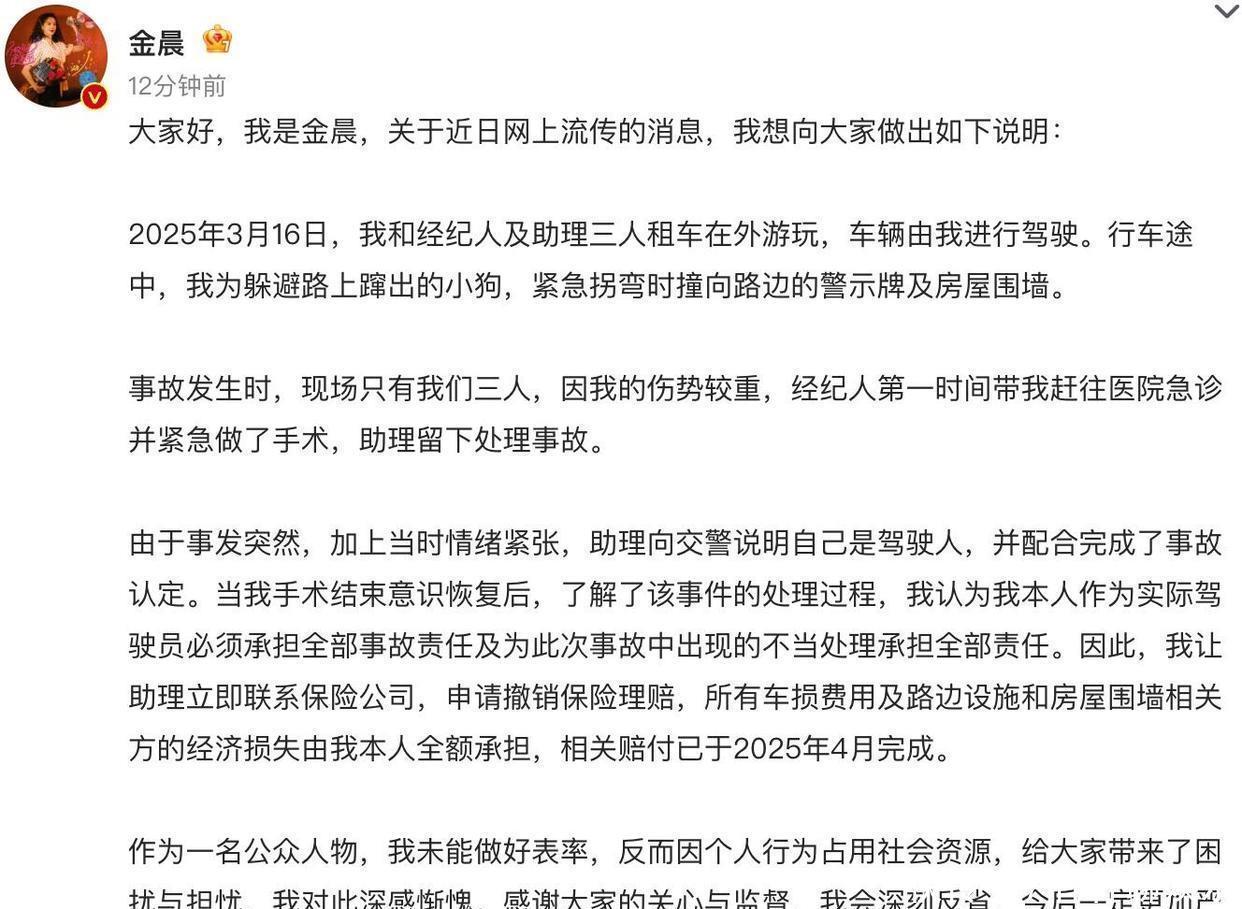 还得说,金晨也提到,车损费,还有路边的设施和农户的围墙啥的责任赔偿,都在事发没多久就一一赔付完毕,处理得挺周到。