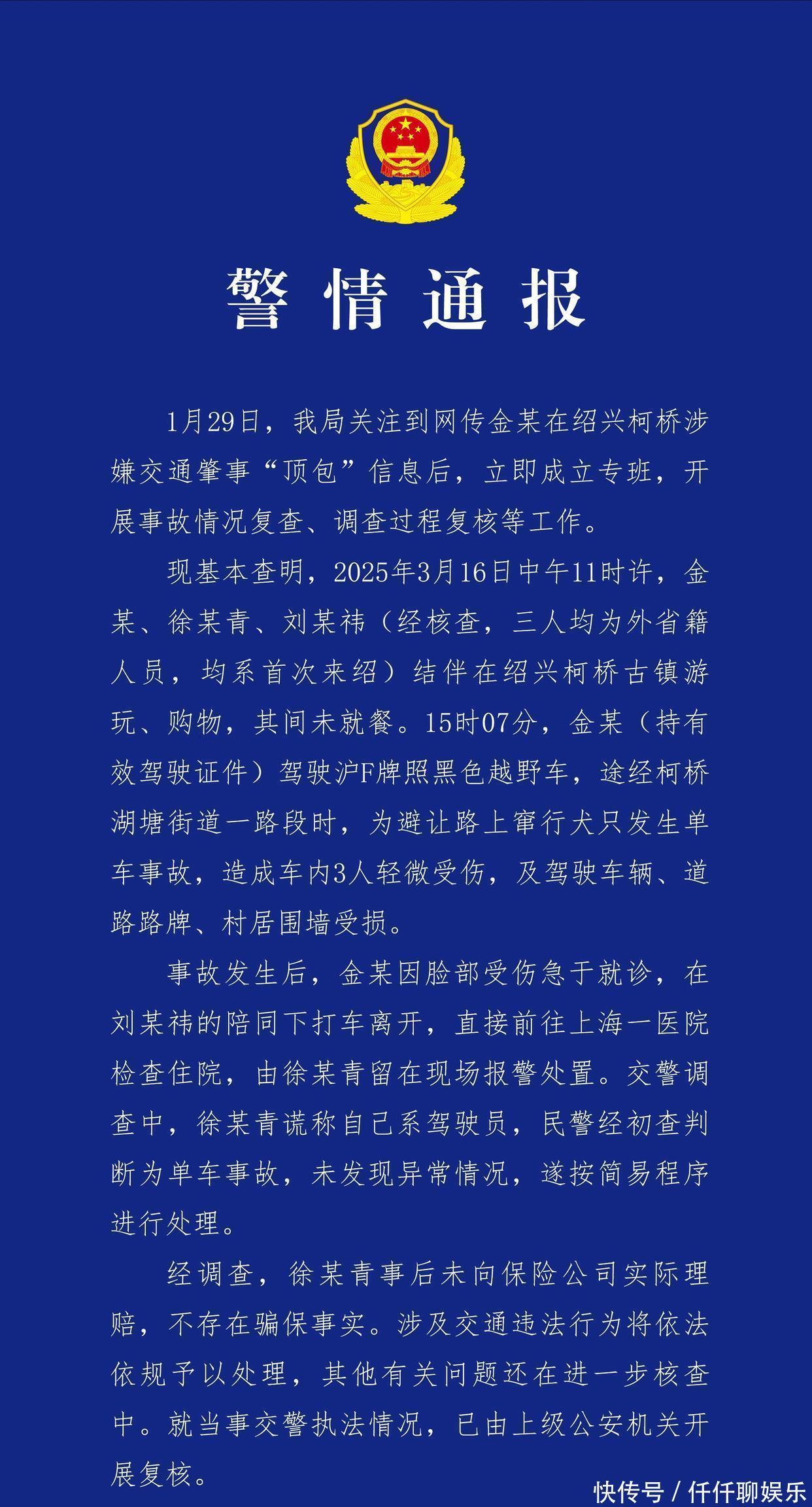 2025年3月16日,金晨开车带着经纪人和助理在绍兴玩耍的时候,为躲避路上跑来跑去的狗,结果撞上了农户的墙。