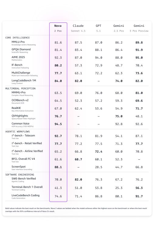 Nova 2 Pro是亚马逊最智能的推理模型,可处理文本、图像、视频和语音并生成文本,适用于代理编码、长期规划等高度复杂任务。该模型在与Claude Sonnet 4.5的16项基准测试中有10项表现更优或持平,与GPT-5.1的16项测试中有8项更优或持平,与Gemini 2.5 Pro的19项测试中有15项更优或持平。